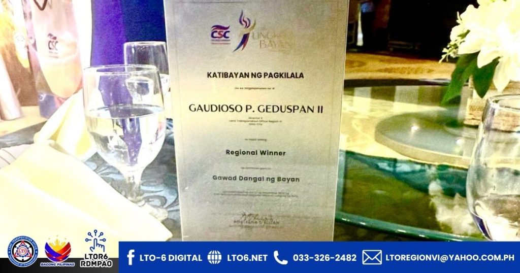 ILOILO CITY โ In a ceremony that honored the regionโs public-service standouts, Land Transportation Office โ Region VI Director Atty. Gaudioso P. Geduspan II was honored as a Regional Winner of the Gawad Dangal ng Bayan, receiving a Plaque of Recognition from the Civil Service Commission โ Region VI at the Pasidungog sa mga Lingkod Bayani sa Rehiyon at the Grand Xing Imperial Hotel.